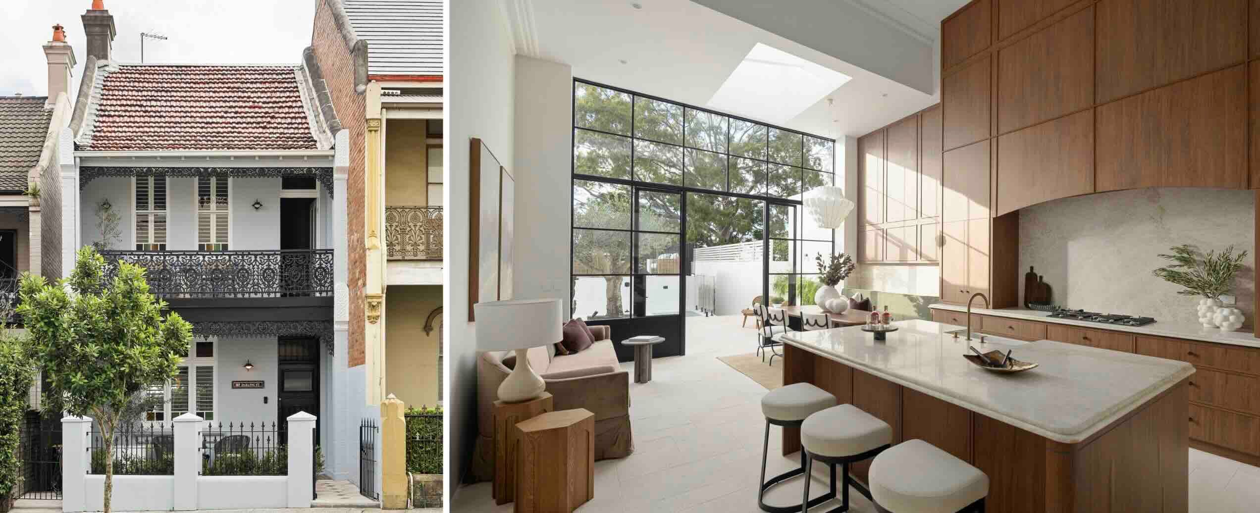 Michael Mileski Design Studio and Kinwolf Projects redesigned this classic terrace. Atrium ceilings, double-height steel-framed glazing, and floor-to-ceiling timber joinery throughout. Marble island kitchen, banquette dining, integrated fridge/freezer. Top-floor retreat with wet bar. Stone courtyard, plunge pool, dual-access block with garage parking. One block to Elkington Park.